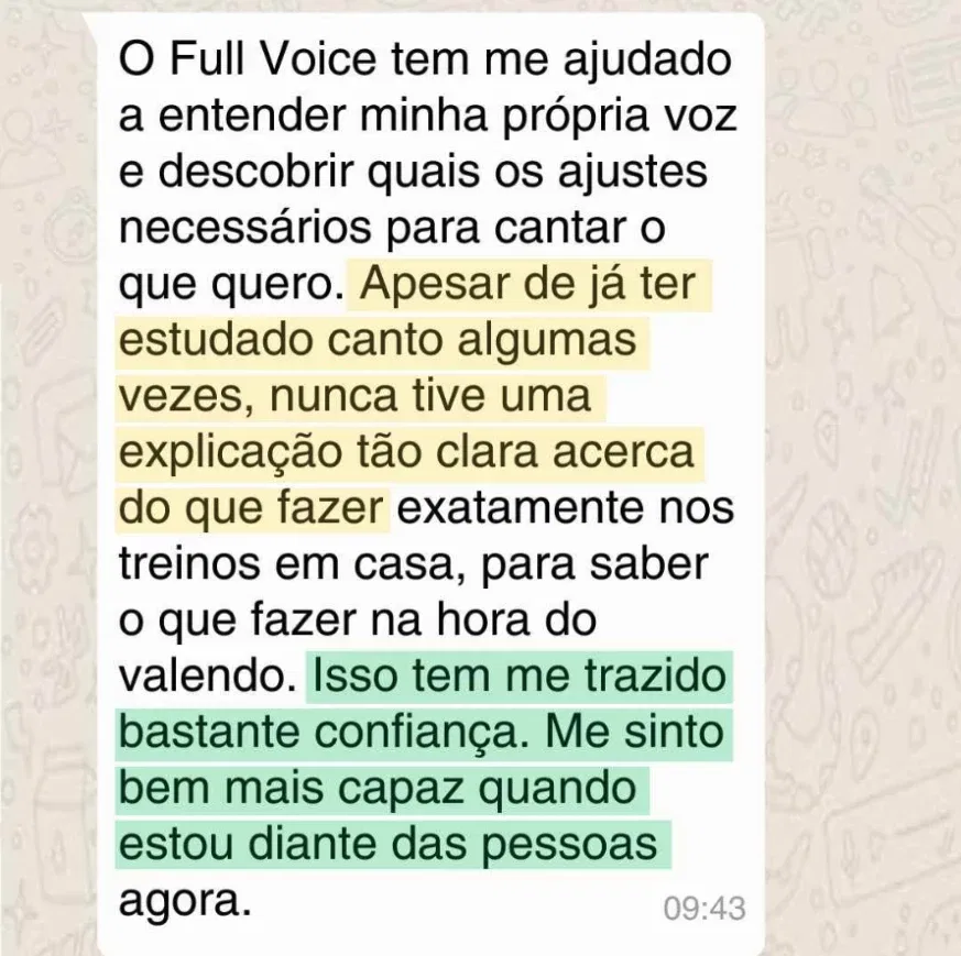 Esse é exatamente o perfil de quem mais evolui no Full Voice® Club. O método começa pelo que os outros pulam: entender como sua voz funciona na prática antes de qualquer técnica.